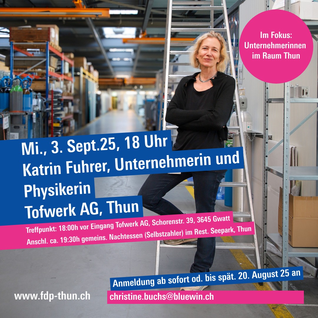 Unternehmerinnen im Fokus rückt Frauen ins Zentrum, die im Raum Thun Unternehmen führen, prägen und weiterentwickeln. Bei Betriebsbesuchen und Gesprächen erfahren wir aus erster Hand, wie Unternehmertum gelebt wird – von den ersten Ideen über mutige Schritte bis zu aktuellen Herausforderungen. Die Eventreihe schafft Raum für Inspiration, Dialog und Vernetzung und macht weibliches Unternehmertum sichtbar und greifbar.